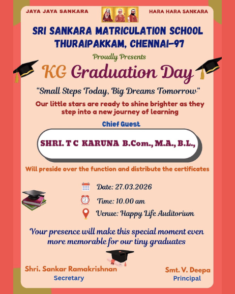 Sri Sankara Matriculation School, established on June 11, 2001, by the esteemed late Mr. Ramakrishnan under the divine blessings of His Holiness Sri Kanchi Kamakoti Peedhaadhipathi Sri Jayendra Saraswathi Swamigal and His Holiness the Sage of Kanchi, Maha Swamigal, stands as a pillar of educational excellence in Thuraipakkam. The school caters to students from Pre-KG through Class 10, diligently following the Tamil Nadu State Curriculum.